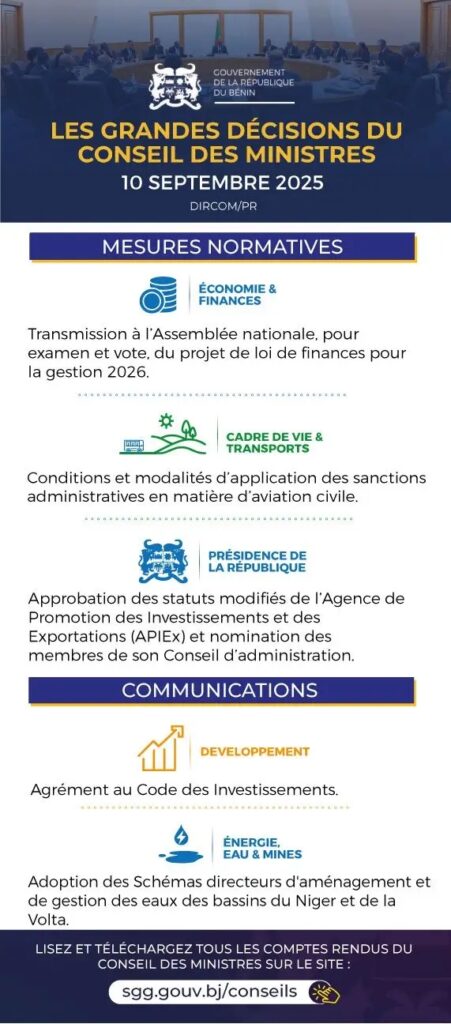 Conseil des ministres au Bénin: les grandes décisions de ce 10 septembre 2025