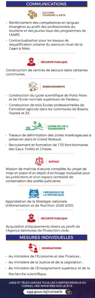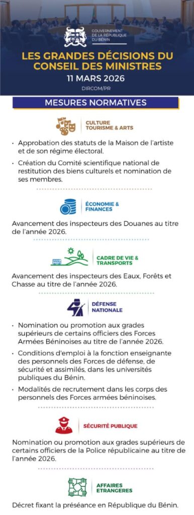 Les membres du gouvernement se sont réunis en Conseil des ministres ce mercredi 11 mars 2026 sous la présidence du chef de l’État, Patrice Talon. Au terme de cette réunion, plusieurs décisions ont été prises et des nominations ont été prononcées.